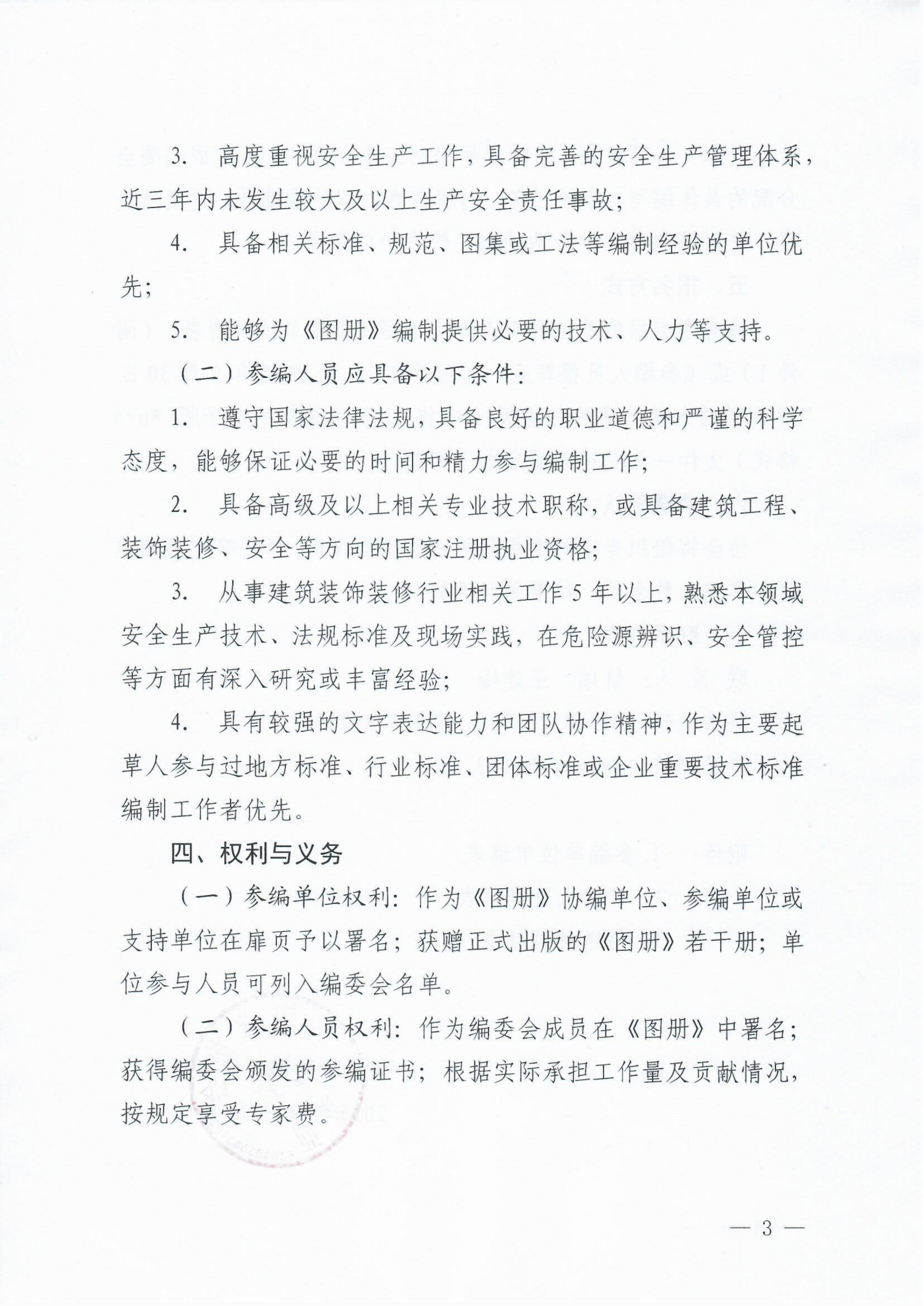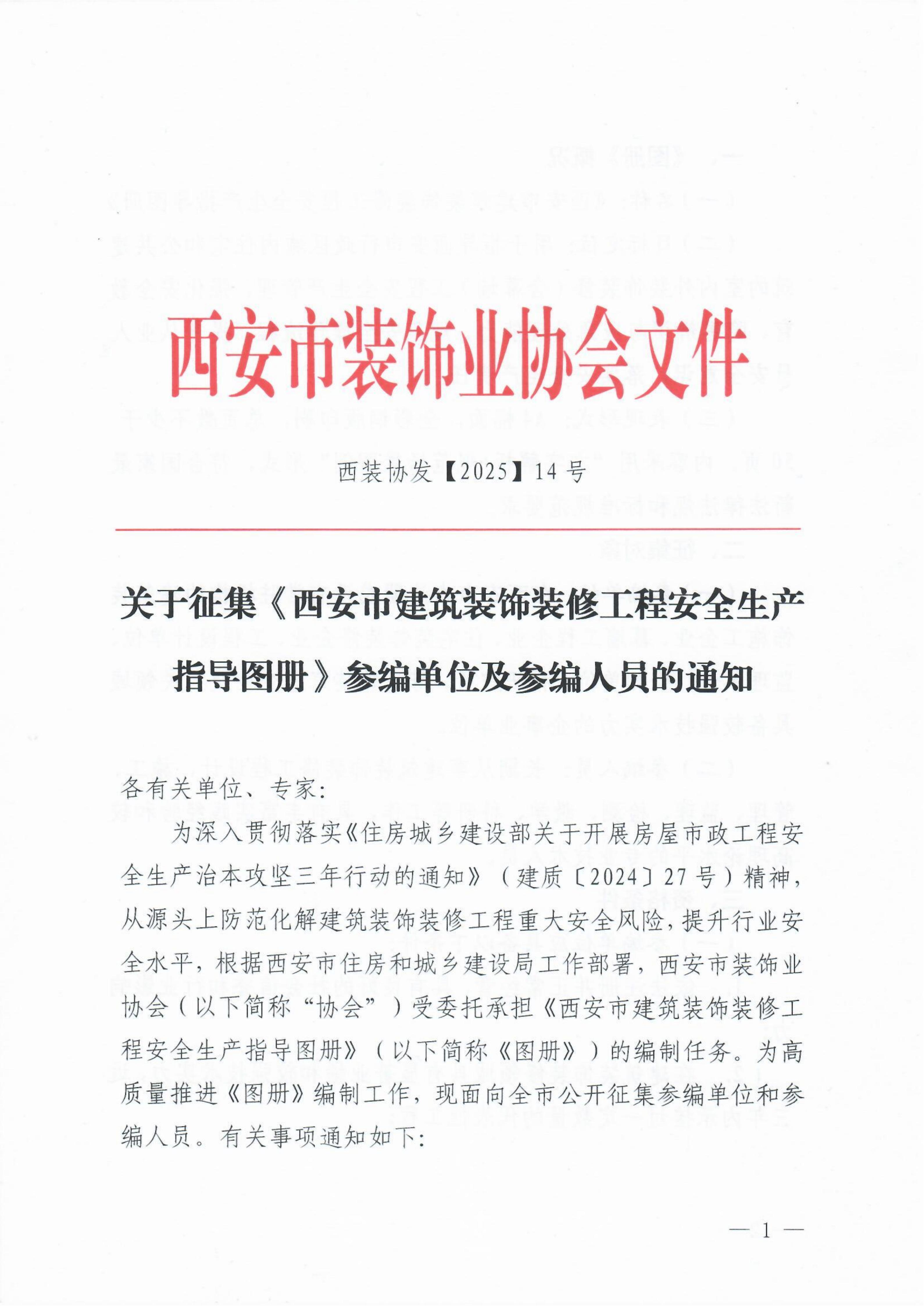 为深入贯彻落实《住房城乡建设部关于开展房屋市政工程安全生产治本攻坚三年行动的通知》(建质〔2024〕27号)精神,从源头上防范化解建筑装饰装修工程重大安全风险,提升行业安全水平,根据西安市住房和城乡建设局工作部署,西安市装饰业协会(以下简称“协会”)受委托承担《西安市建筑装饰装修工程安全生产指导图册》(以下简称《图册》)的编制任务。为高质量推进《图册》编制工作,现面向全市公开征集参编单位和参编人员。有关事项通知如下: