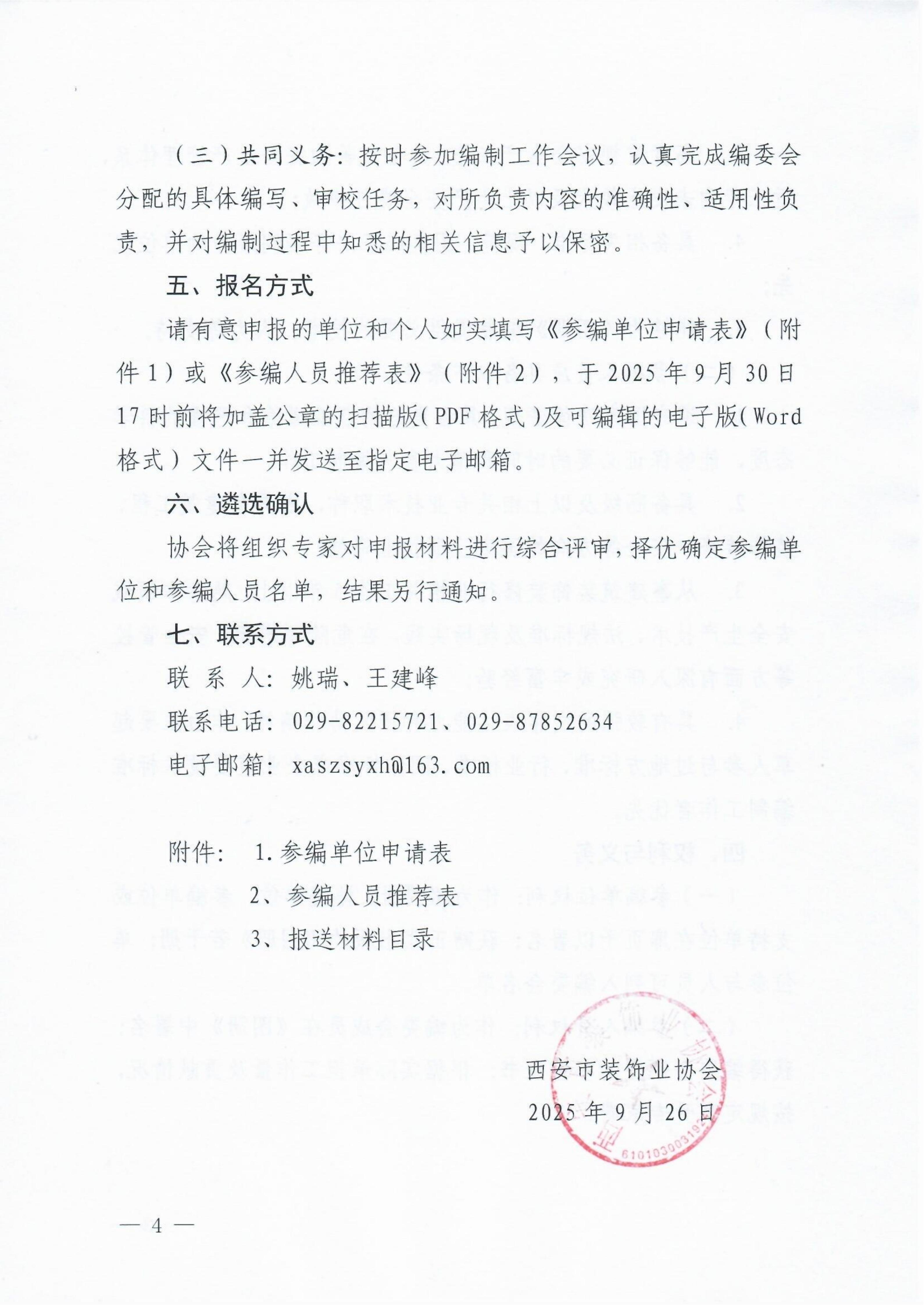 (一)参编单位:在西安市内注册或设有常驻机构的建筑装饰施工企业、幕墙工程企业、住宅装饰装修企业、工程设计单位、监理单位、检测单位、科研院所、陈设软装家居企业及相关领域具备较强技术实力的企事业单位。