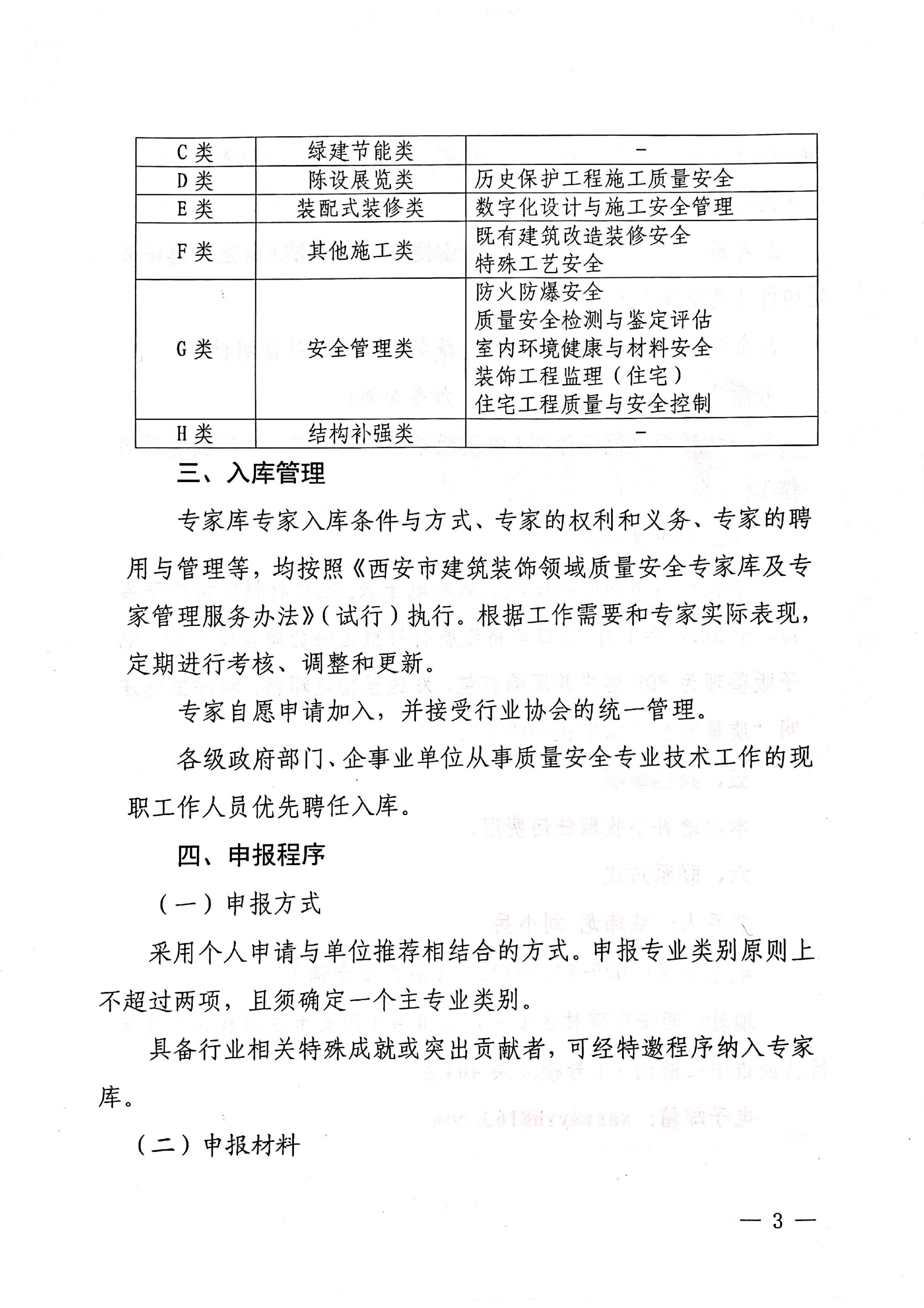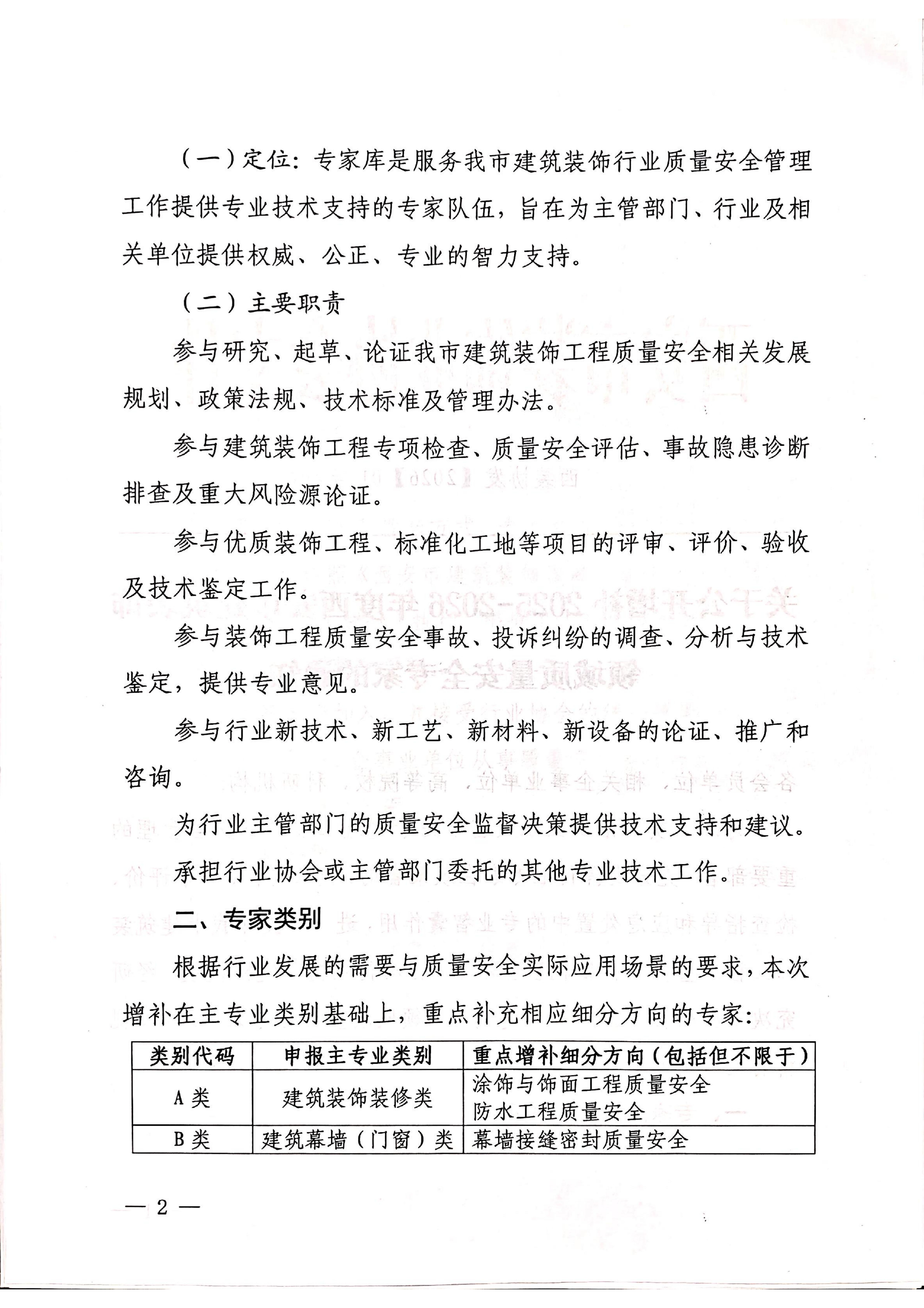 为深入贯彻落实国家及省市关于建筑工程质量安全管理的重要部署,充分发挥行业专家在政策咨询、技术支撑、评审评价、检查指导和应急处置中的专业智囊作用,进一步提升我市建筑装饰工程质量安全精细化管理水平,推动行业持续健康发展,经研究决定面向社会公开增补建筑装饰领域质量安全专家库成员,现将有关事项通知如下: