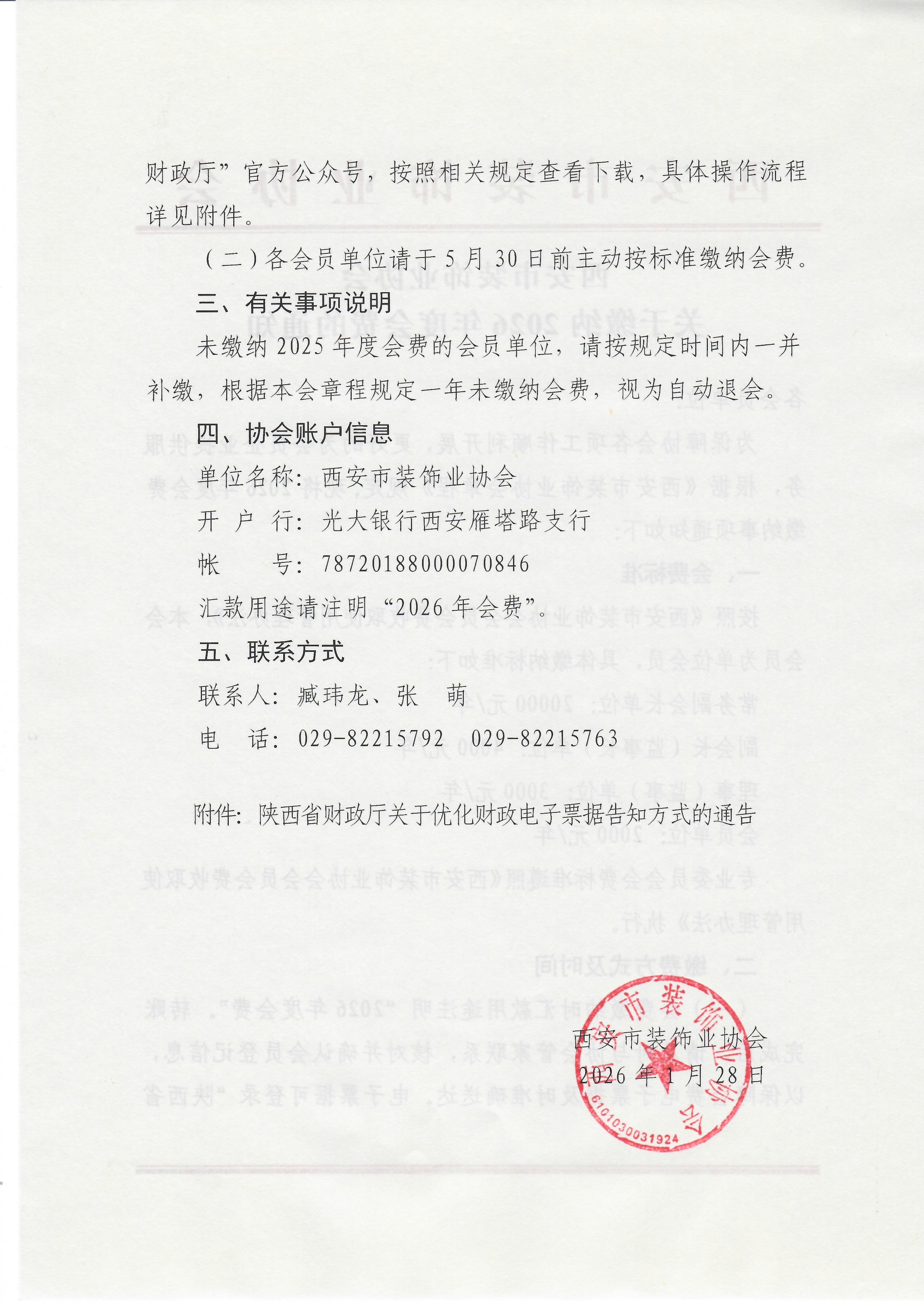 (一)会费缴纳时汇款用途注明“2026年度会费”。转账完成后,请及时与协会管家联系,核对并确认会员登记信息,以保障会费电子票据及时准确送达。电子票据可登录“陕西省财政厅”官方公众号,按照相关规定查看下载,具体操作流程详见附件。
