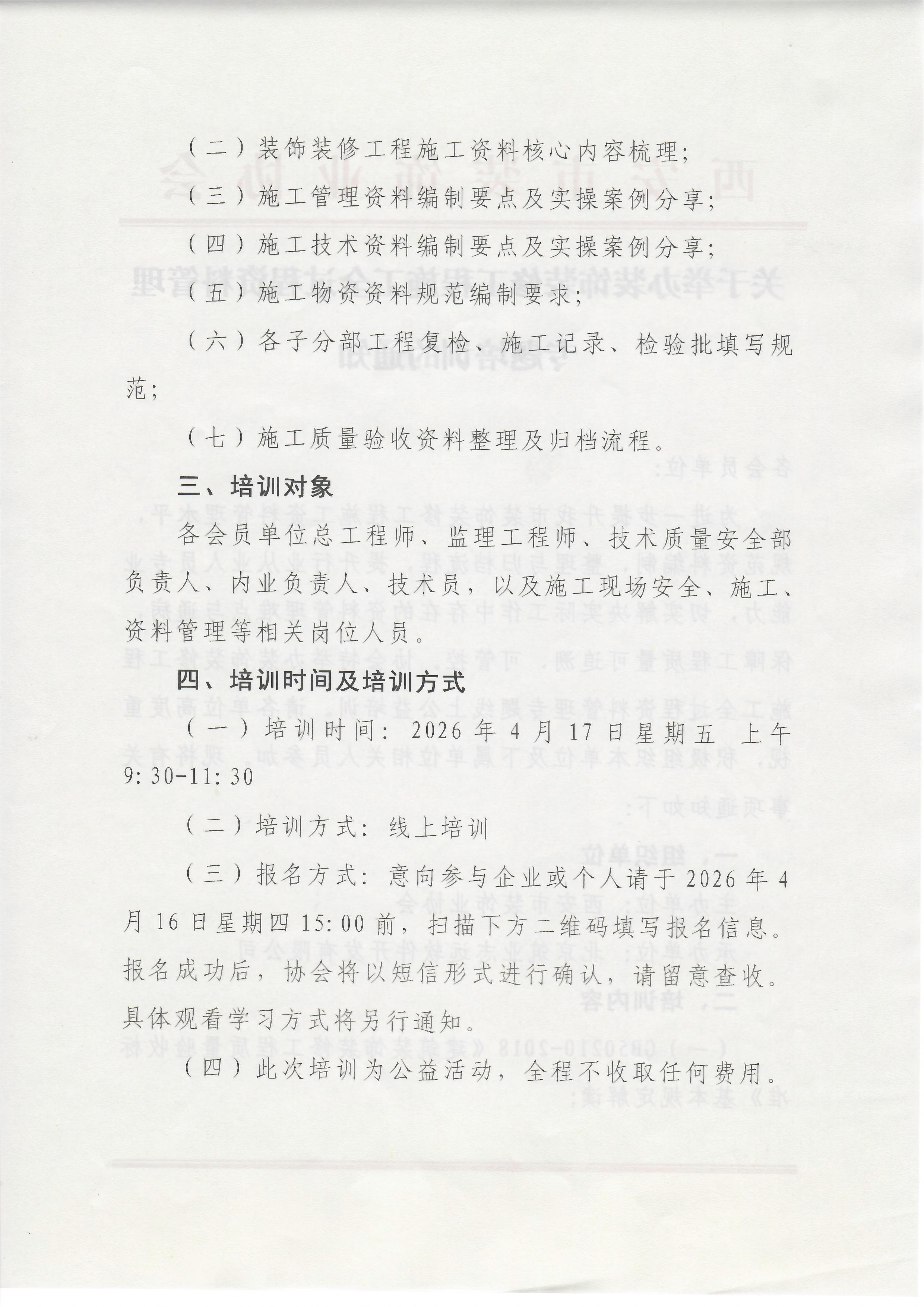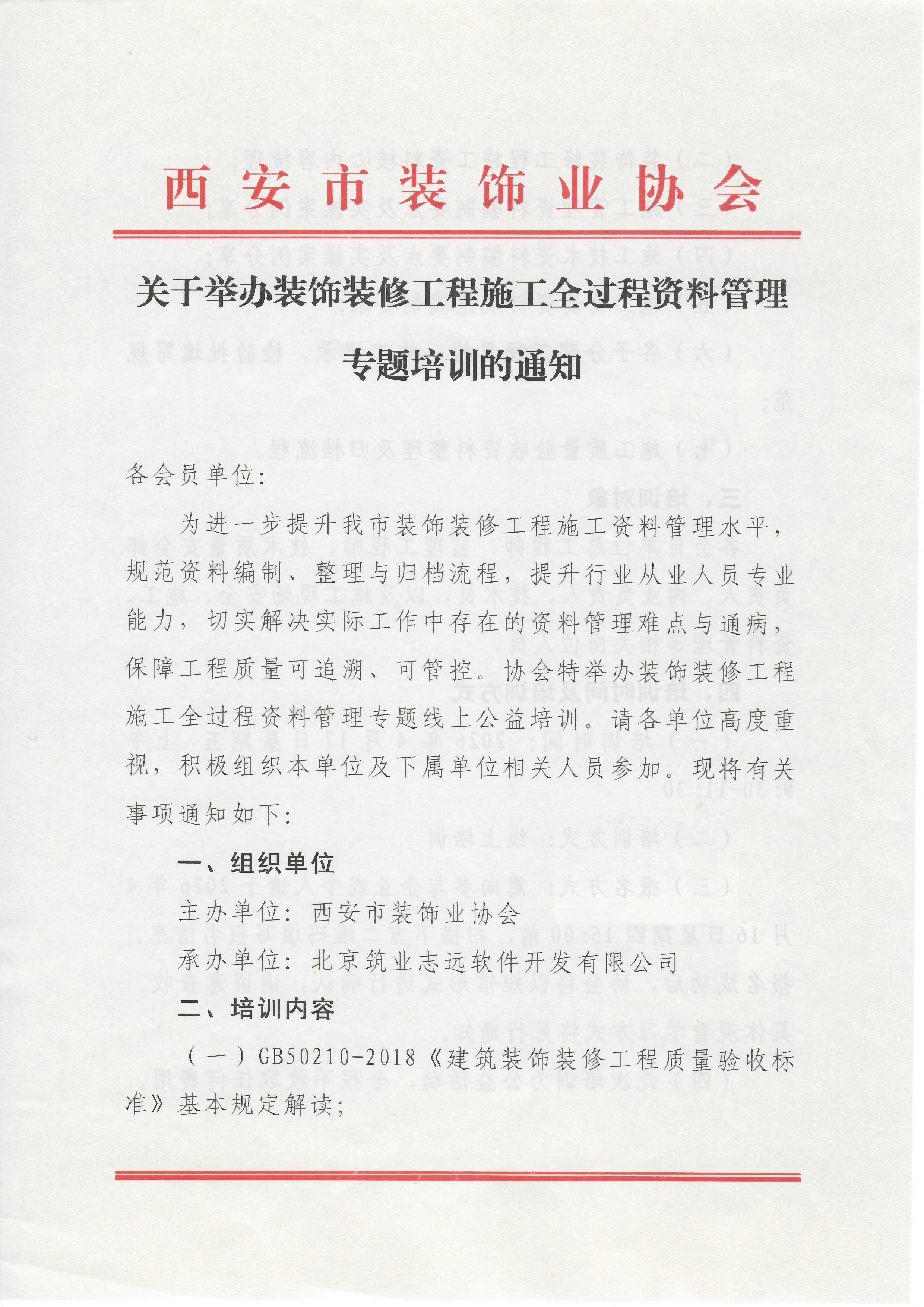 为进一步提升我市装饰装修工程施工资料管理水平,规范资料编制、整理与归档流程,提升行业从业人员专业能力,切实解决实际工作中存在的资料管理难点与通病,保障工程质量可追溯、可管控。协会特举办装饰装修工程施工全过程资料管理专题线上公益培训。请各单位高度重视,积极组织本单位及下属单位相关人员参加。现将有关事项通知如下: