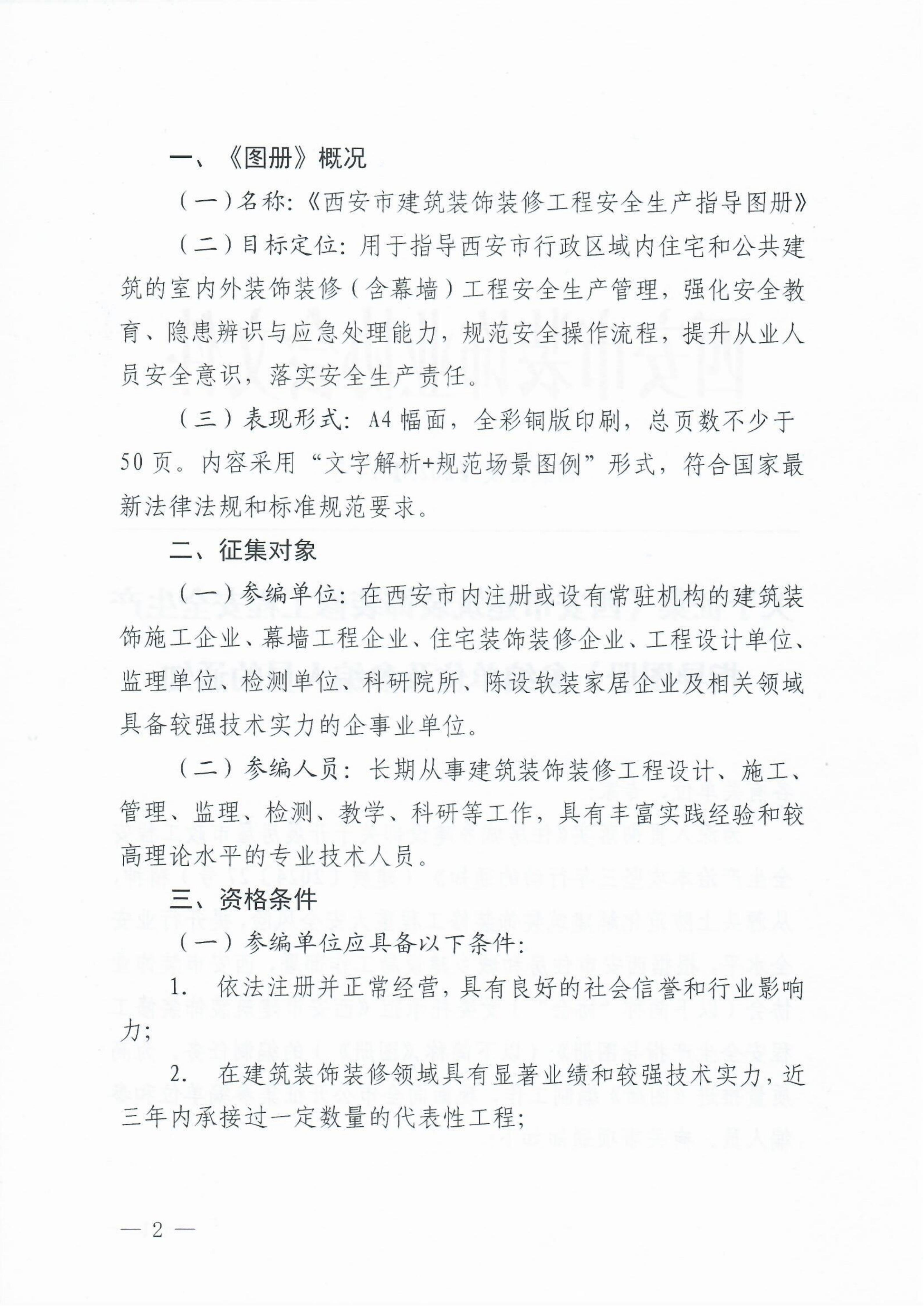 为深入贯彻落实《住房城乡建设部关于开展房屋市政工程安全生产治本攻坚三年行动的通知》(建质〔2024〕27号)精神,从源头上防范化解建筑装饰装修工程重大安全风险,提升行业安全水平,根据西安市住房和城乡建设局工作部署,西安市装饰业协会(以下简称“协会”)受委托承担《西安市建筑装饰装修工程安全生产指导图册》(以下简称《图册》)的编制任务。为高质量推进《图册》编制工作,现面向全市公开征集参编单位和参编人员。有关事项通知如下: