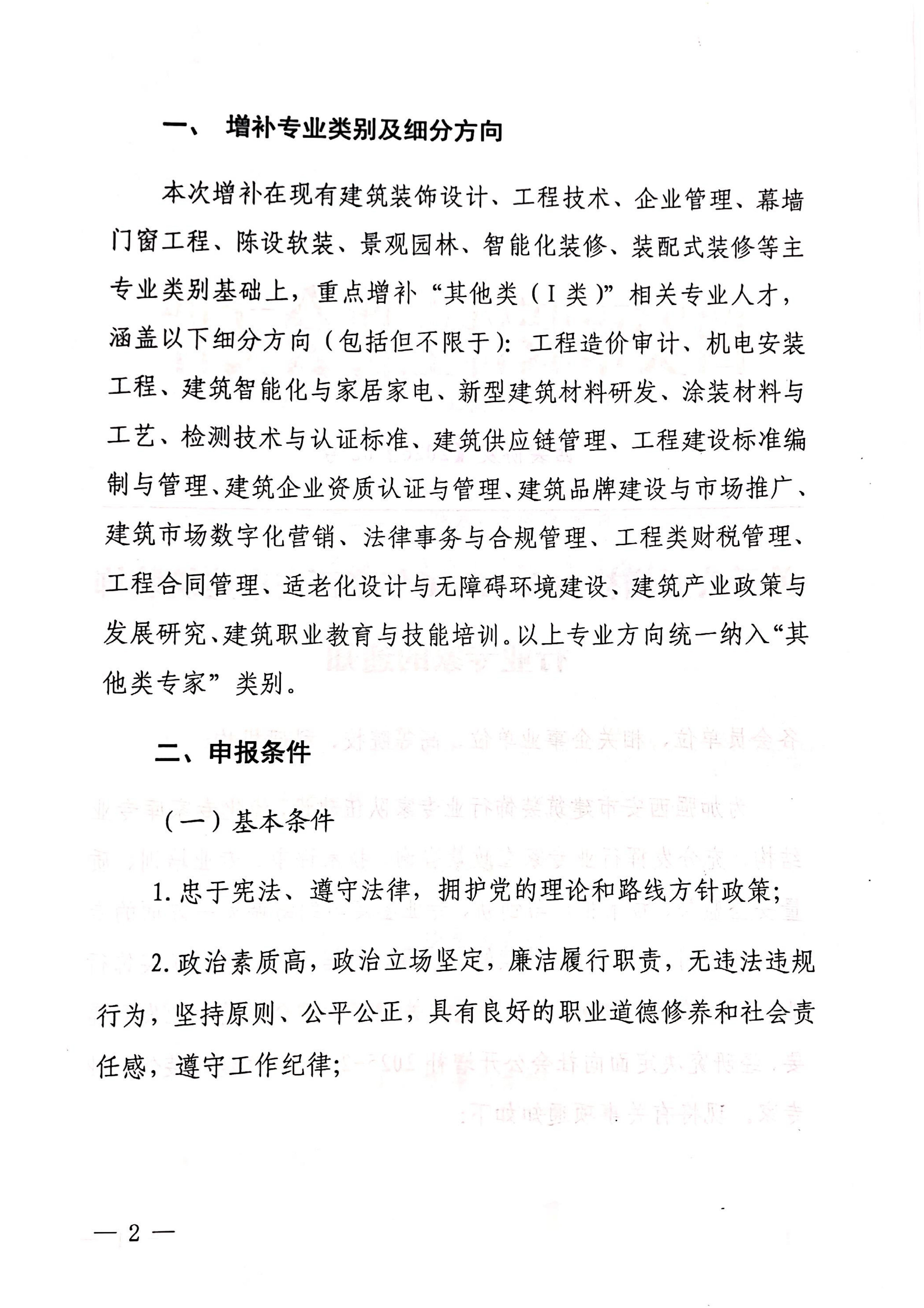 本次增补在现有建筑装饰设计、工程技术、企业管理、幕墙门窗工程、陈设软装、景观园林、智能化装修、装配式装修等主专业类别基础上,重点增补“其他类(I类)”相关专业人才,涵盖以下细分方向(包括但不限于):工程造价审计、机电安装工程、建筑智能化与家居家电、新型建筑材料研发、涂装材料与工艺、检测技术与认证标准、建筑供应链管理、工程建设标准编制与管理、建筑企业资质认证与管理、建筑品牌建设与市场推广、建筑市场数字化营销、法律事务与合规管理、工程类财税管理、工程合同管理、适老化设计与无障碍环境建设、建筑产业政策与发展研究、建筑职业教育与技能培训。以上专业方向统一纳入“其他类专家”类别。