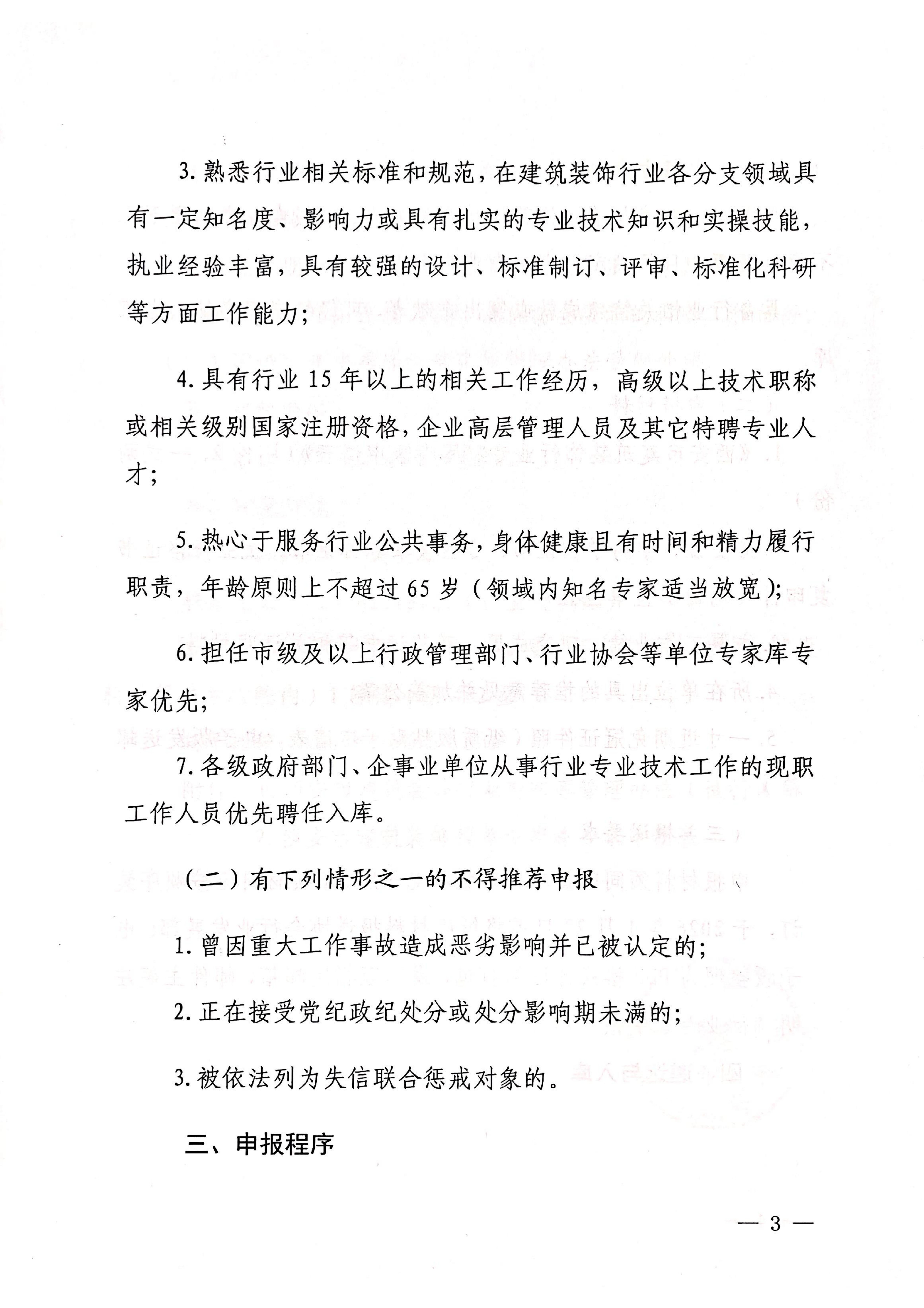 3.熟悉行业相关标准和规范,在建筑装饰行业各分支领域具有一定知名度、影响力或具有扎实的专业技术知识和实操技能,执业经验丰富,具有较强的设计、标准制订、评审、标准化科研等方面工作能力;