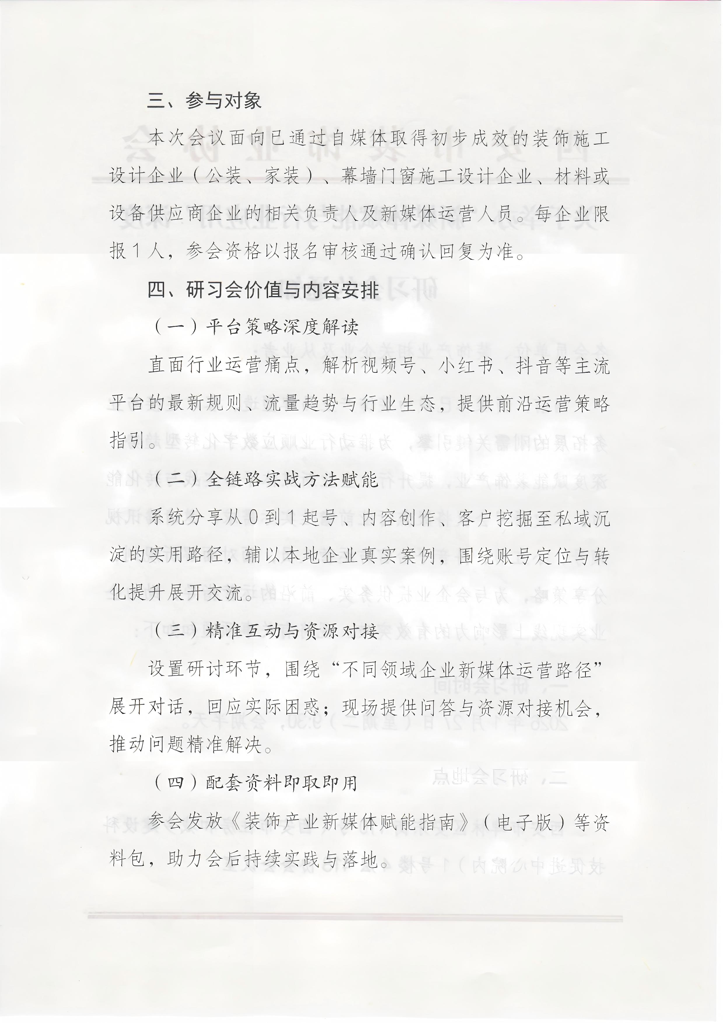当前,新媒体已成为装饰产业品牌塑造、客户连接与业务拓展的刚需关键引擎,为推动行业顺应数字化转型趋势,深度赋能装饰产业,提升行业企业新媒体平台实战与转化能力,本次研习会议将聚焦行业前瞻性实际需求,邀请腾讯视频号、小红书、抖音平台官方运营人员,面对面解析规则、分享策略,提供务实、前沿的运营指导,助力企业实现线上影响力的有效突破。现将有关事项通知如下: