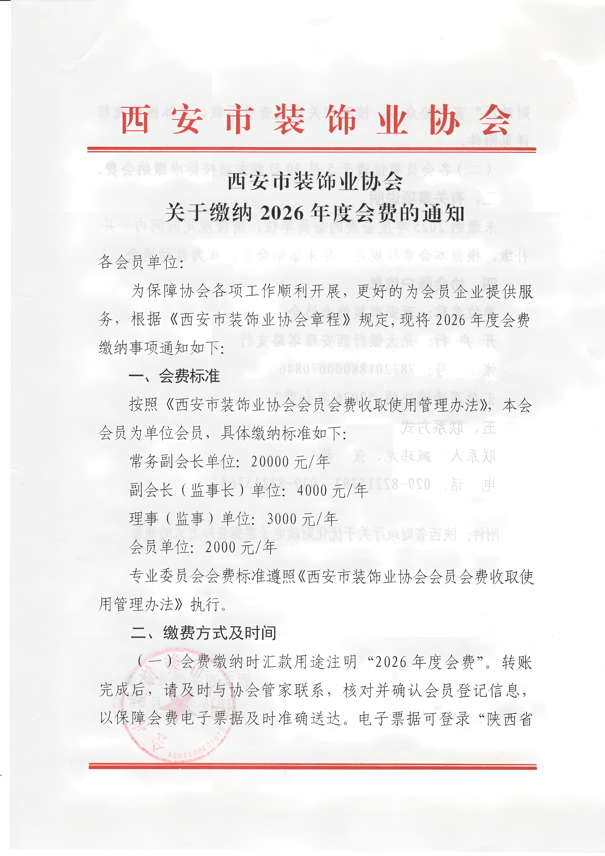 为保障协会各项工作顺利开展,更好的为会员企业提供服务,根据《西安市装饰业协会章程》规定,现将2026年度会费缴纳事项通知如下: